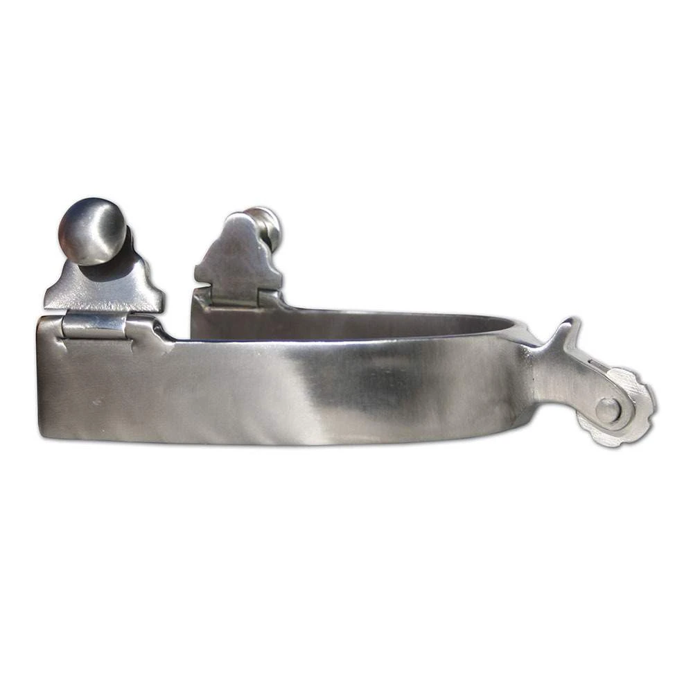 A great polished steel spur with a short shank, chap guard, and a six-point rosebud rowel. Shank: 1″, Band: 3/4″.